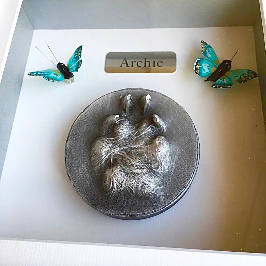 Small sized dog paw impression mounted onto an 8x8 inch handmade textured white wood frame with personalised name plaque & blue butterfly embellishments